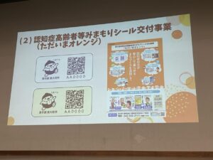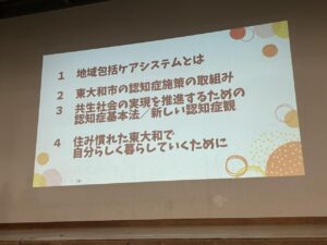 その後、地域包括ケアシステムにおける認知症施策の取り組みについて、東大和市認知症対策推進部会の部会長及び副部会長より講演があり、自分ごととして取り組まれている様子が伺え、とても為になりました。