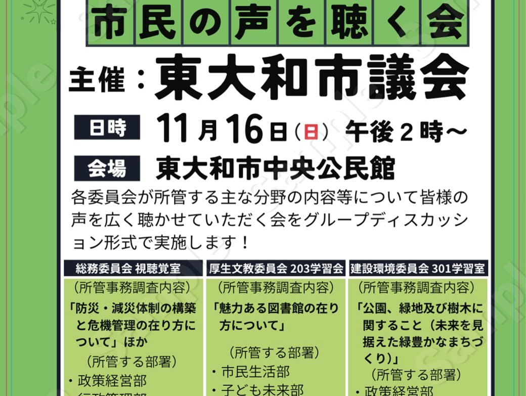 2025年11月16日 「市民の声を聴く会」を開催 2025年11月16日 最終更新日時 : 2025年11月17日 あらはた伸一 本日の午後より、「市民の声を聴く会」を開催いたしました。 前回と同じように、各常任委員会ごとに部屋を分けて実施いたしましたが、所管する分野について幅広い声を伺うことができました。