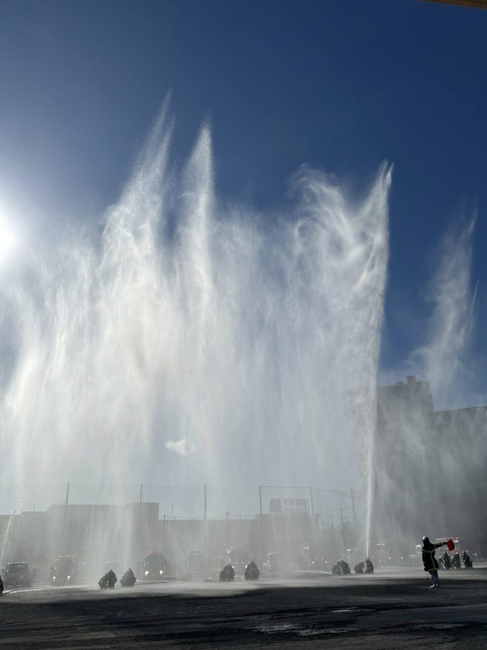 最後に行われた一斉放水では、青空に向かって放たれた水が陽光に照らされ、見事な放物線を描いた。その光景は、地域の平穏を願う力強いメッセージのようでした。