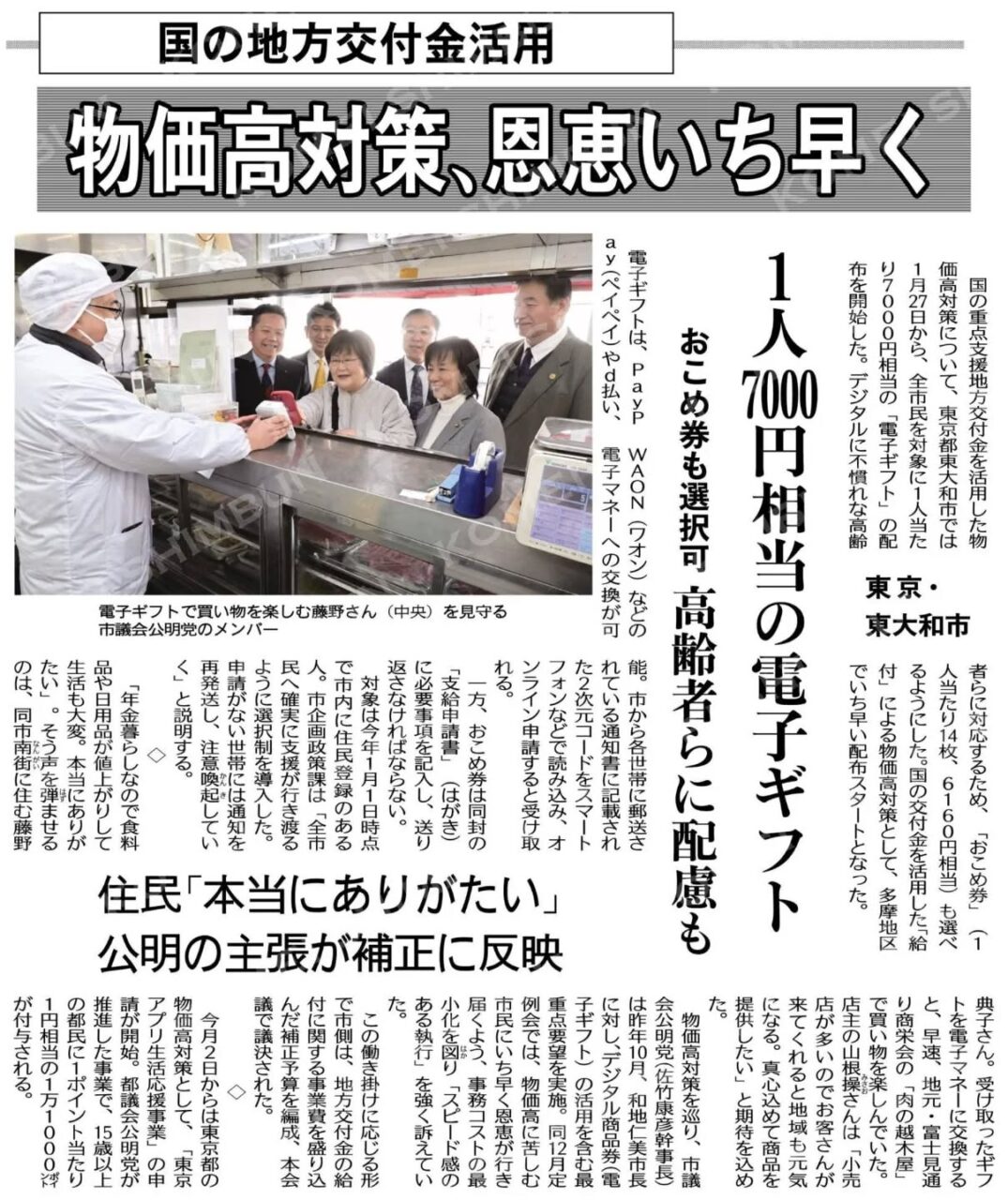 2026年2月3日 【実績報告】物価対策記事が公明新聞に掲載! 2026年2月3日 最終更新日時 : 2026年2月3日 あらはた伸一 東大和市の物価高対策の記事を、本日の公明新聞に掲載してもらいました!